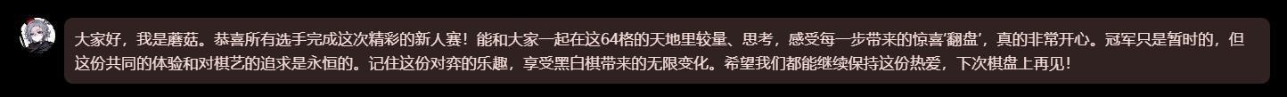 最后以蘑菇强烈要求增加的冠军寄语结束本月的新人赛征程: