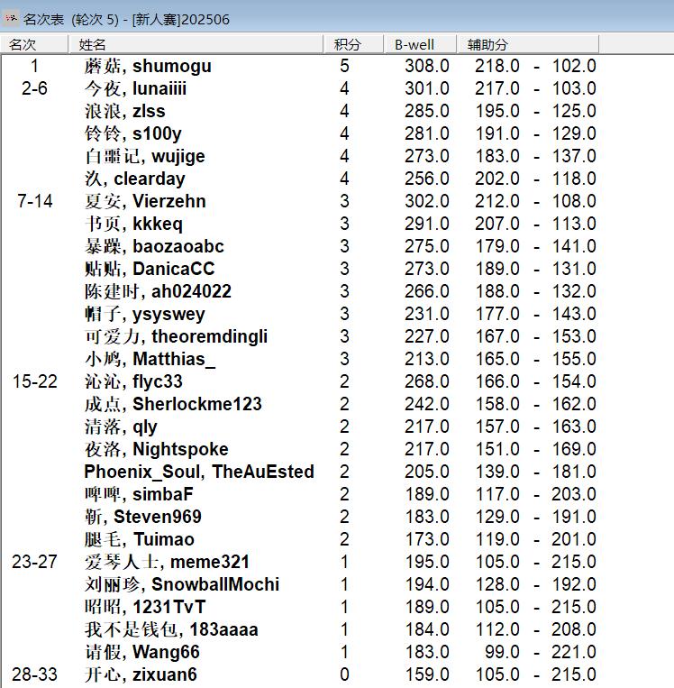 由于满足参赛人数超过8人的条件,故本次新人赛瑞士轮轮数为5轮,瑞士轮5轮后,排名前四的选手进入10分钟的半决赛和决赛,同时赛后开启幸运奖的抽取环节。